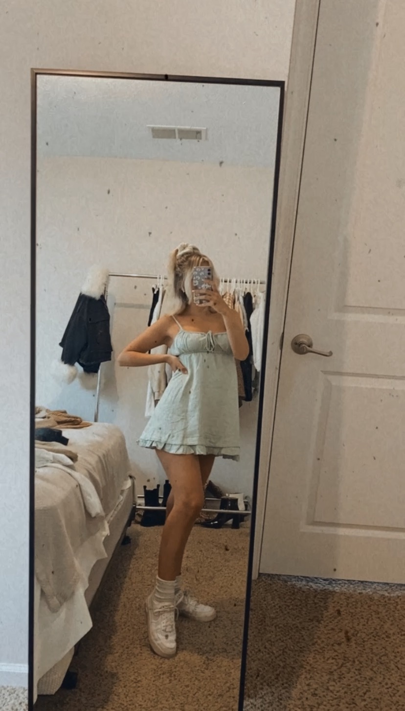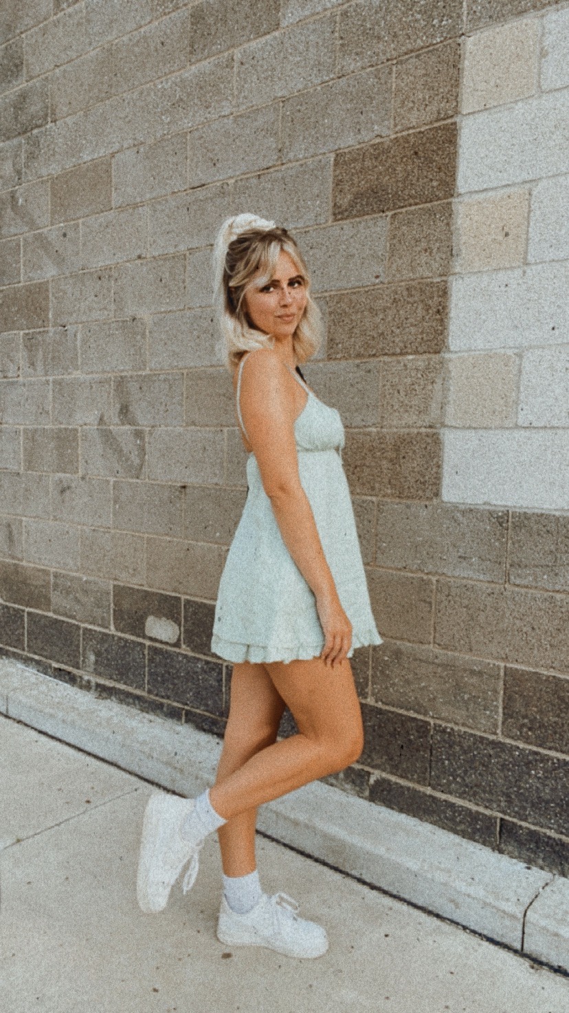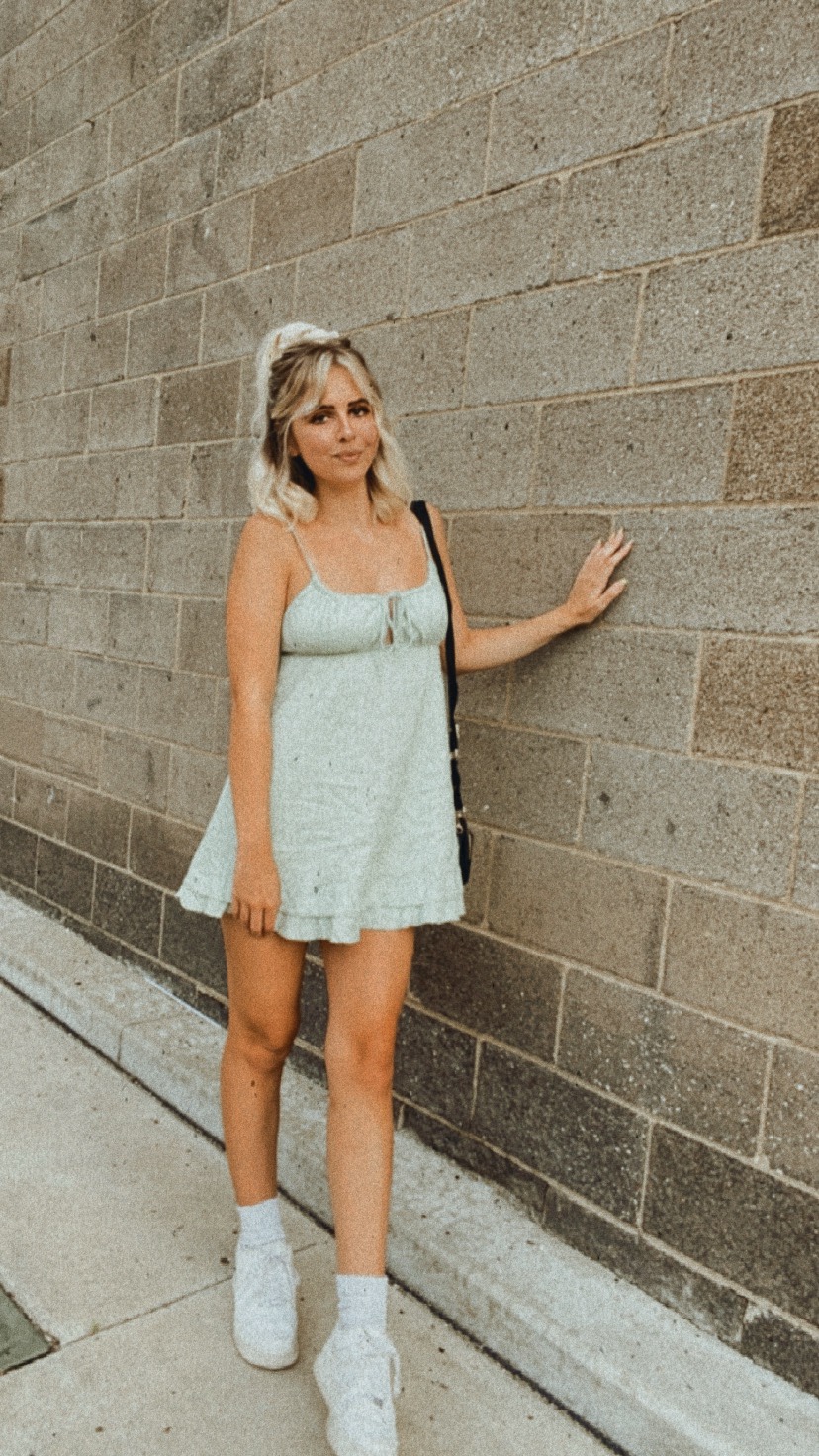 one of my favorite summer dresses! I love wearing dresses because they’re so much easier to style than a bunch of separate pieces. I feel like this dress would be flattering on all body types, I love the sage color and it also comes in white! I wore a cute oversized white scrunchie w this look for really girly, playful vibes. I think this dress would also be cute dressed up with cowboy boots or lace up heels.
