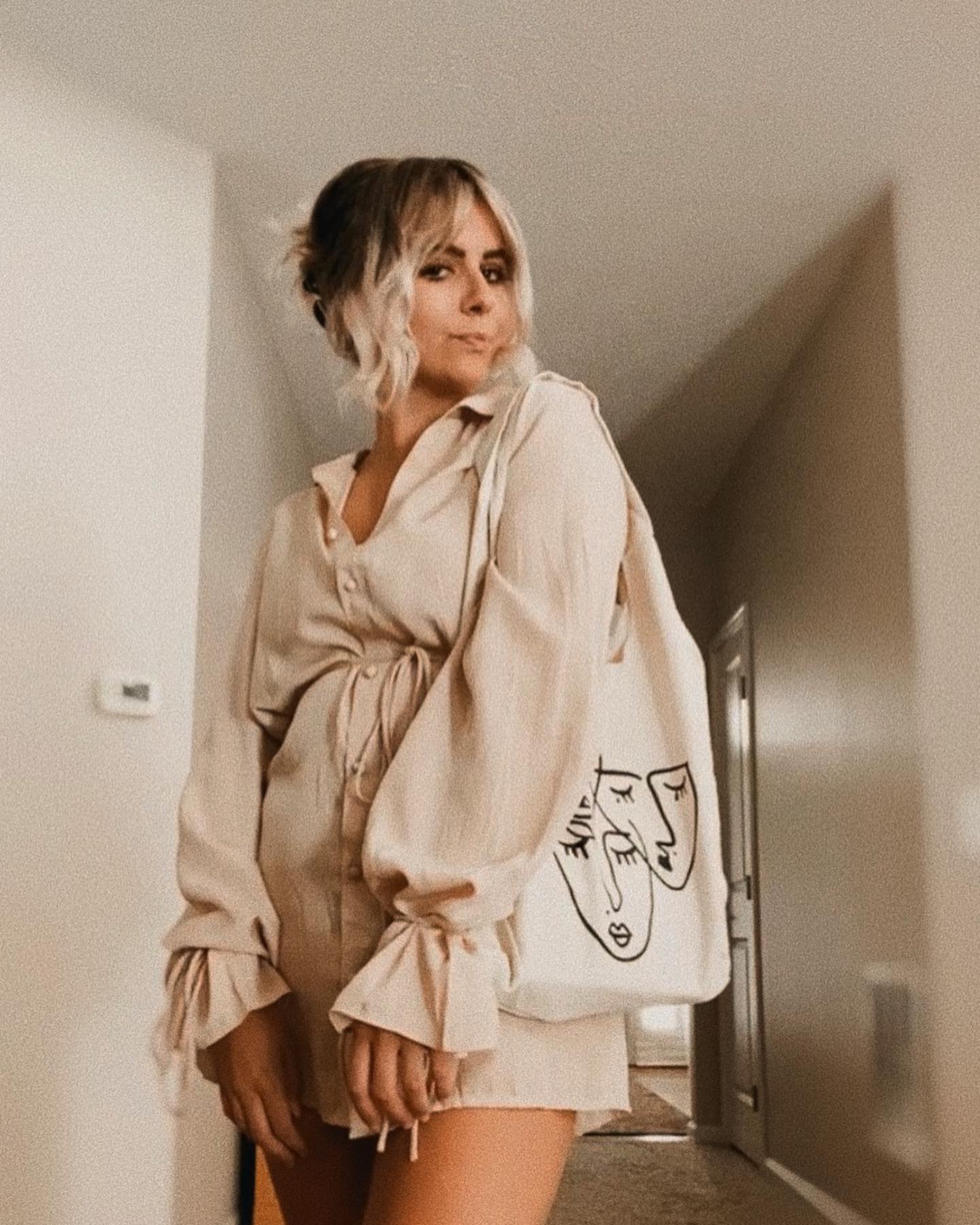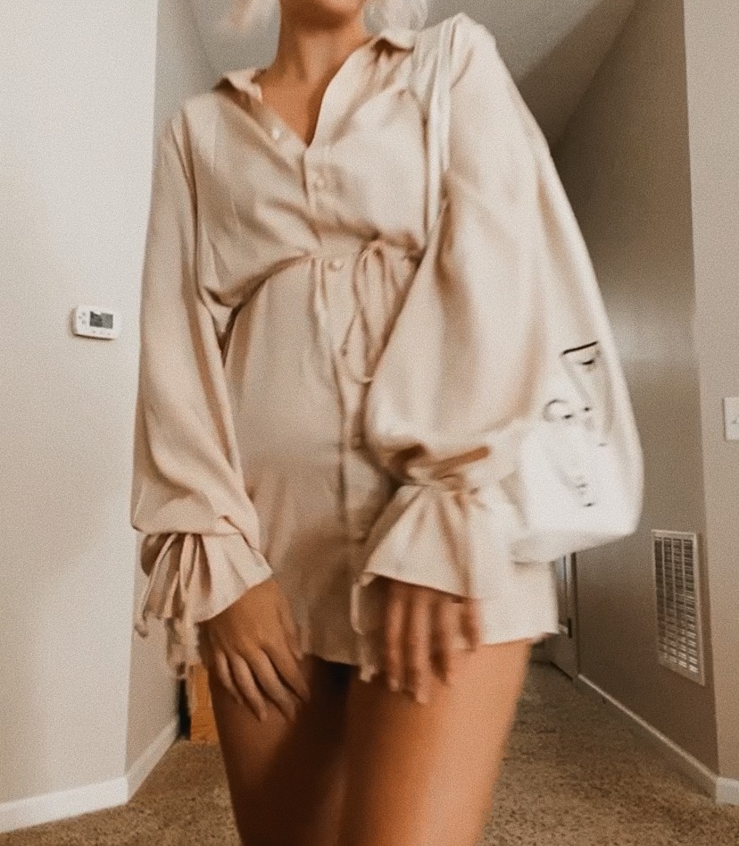 This dress omg! I’m obsessed with the sleeves and the material is so silky and makes me feel so classy. I think this can be worn casually or to a fancy event. It would also be cute unbuttoned and worn as a shirt over another outfit. Also comes in black, super cute!!